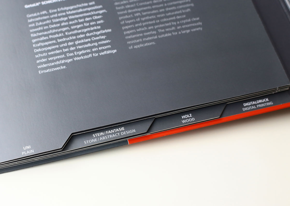 Als Übersicht und praktisches Arbeitsmittel, insbesondere für Architekten, habe ich die sehr aufwändig produzierte Dekormappe gestaltet, die das komplette GetaLit-Sortiment mit Echtmustern beinhaltet.